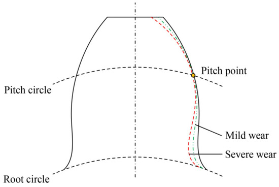 - Dong, N.; Cui, Q.; Zhou, J.; Tong, R.; Wang, H.; Lu, F. Study on wear evolution of spur gears considering dynamic meshing stiffness. J. Mech. Sci. Technol. 2023, 37, 3393–3408. [Google Scholar] [CrossRef]
