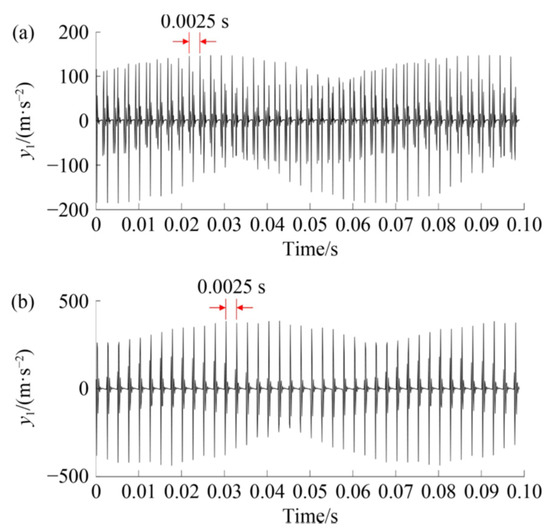 The analytical models with faults follow the same process as the healthy models. The equations to obtain the dynamic response for a system are the same. The main input that establishes the fault condition can be obtained from Equation (7). To define N in Equation (7) correctly, input like the gear mesh stiffness and/or gear transmission error are evaluated. The required input for each fault mode will be explained in detail in Section 3.1, Section 3.2, Section 3.3, Section 3.4 and Section 3.5.