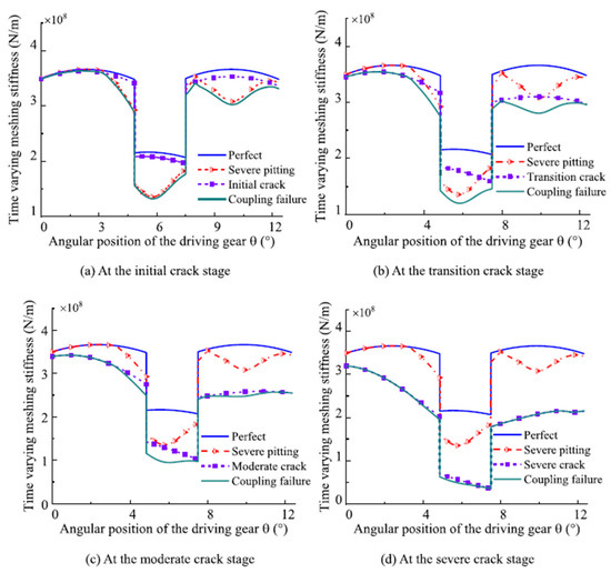 - Chen, Y.; Jin, Y.; Kang, R.; Gong, W.; Yang, Y. The Time-varying Mesh Stiffness Modeling of Gear System with Spalling Defects in Different Positions. In Proceedings of the 2017 4th International Conference on Transportation Information and Safety (ICTIS): Conference Proceedings, Banff, AB, Canada, 8–10 August 2017; pp. 658–663. [Google Scholar]