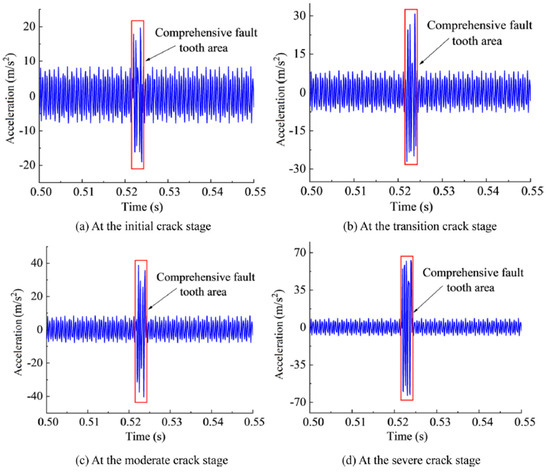 - Mohammed, O.D.; Rantatalo, M.; Aidanpää, J.O.; Kumar, U. Vibration signal analysis for gear fault diagnosis with various crack progression scenarios. Mech. Syst. Signal Process. 2013, 41, 176–195. [Google Scholar] [CrossRef]