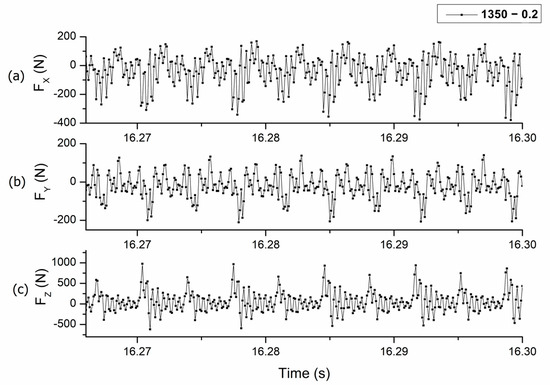 Cutting force signals during the milling of UNS S32750 alloy using 1350 m/min and 0.2 mm/tooth: (a) Fx signals, (b) Fy signals, and (c) Fz signals.