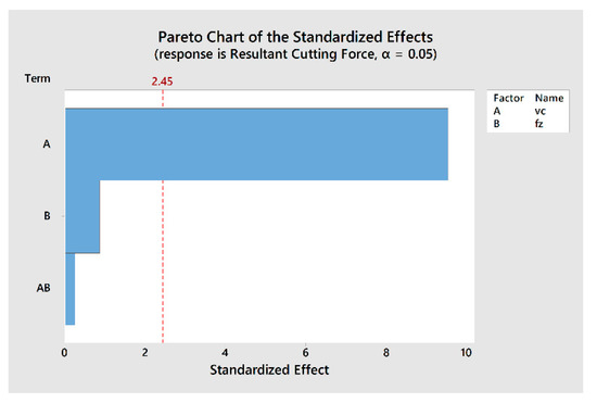 Further analyses were conducted to assess the impacts of both cutting speed and feed rate on cutting force. The Pareto chart analysis indicates that the sole parameter significantly influencing cutting force is the cutting speed (Figure 4). The findings reveal that the primary factors affecting the process are temperature and strain rate, which are intricately tied to cutting speed. Both are critical variables in machining operations, with cutting speed acting as a key determinant. Elevated cutting speeds commonly result in heightened temperatures and strain rates due to higher friction and deformation effects. This explains the fundamental role of cutting speed in cutting process conditions and outcomes, especially for alloys that have low thermal conductivity and susceptibility to strain hardening.