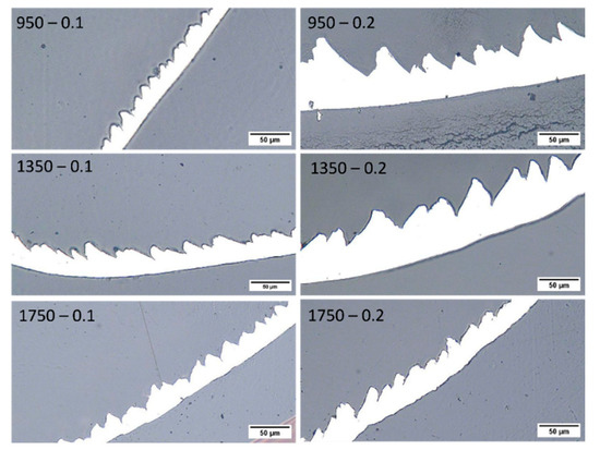 Figure 6 shows optical images of the chips corresponding to the tested cutting parameters, revealing their similar serrated shapes.
