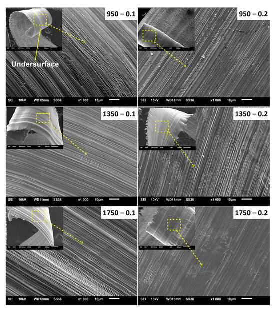 Typically, the chip type and undersurface morphology serve as direct indicators of the prevailing frictional conditions at the tool–chip interface [21]. In Figure 8, SEM images of chip undersurfaces generated at varying cutting speeds and feed rates provide valuable insights into the frictional behavior intrinsic to the machining process. Notably, at a cutting speed of 1750 m/min and a feed rate of 0.20 mm/tooth, a distinct stick–slip phenomenon is observed on the undersurface of the chips. This phenomenon arises due to the rapid temperature elevation, facilitating the weldability of the workpiece material to the rake face of the tool. Consequently, with increasing cutting speed, chips become more prone to localized melting and adherence to the tool face in the form of built-up edges and layers [29,31].