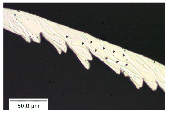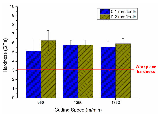 The chips show around 80% higher hardness compared to the undeformed workpiece. The hardness of the as-received material of UNS S32750 alloy is 3.3 ± 0.2 GPa (330 HV), while the hardness of the chips is shown in Figure 11. The hardness of the chips for all the cutting parameters tested has not shown significant differences, fluctuating around 6 GPa (600 HV). The increase in the hardness value is attributed to the UNS S32750’s high sensitivity to strain hardening, which leads to the development of several dislocation barriers in the microstructure and diminishes the dislocation mobility [33].