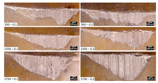 Figure 9 shows chip-free surfaces generated under various cutting parameters. The surface of the chip presents a textured roughness, marked by a lamellar pattern resulting from a slipping mechanism, evident across all cutting speeds. Lamellas are notably smaller and more uniform at lower cutting speeds (950 and 1350 m/min). However, as the cutting speed escalates, the distinct lamella pattern becomes more pronounced, indicating a greater segmentation of the chip (1750 m/min) [30].
