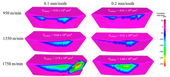 Analyzing the Alicona images (Figure 13), it is noticeable how the tool wear progresses with the increase in cutting speeds. The volumetric wear is gradually higher when using higher cutting speeds, the only exception is with 0.1 mm/tooth and 1750 m/min where significant chipping happened. This chipping is characteristic of adhesive wear. Because of the low thermal conductivity of both, the tool and workpiece materials, the temperature of the cutting zone rapidly exceeded 1000 °C, as will be discussed further in Section 3.4. Consequently, at such high cutting temperatures, there was a propensity for chips or workpiece materials to bond to the tool surface, resulting in adhesive wear [27]. In general, the substantial cutting force and elevated cutting temperature were likely to increase tool wear under ultra-high-speed cutting conditions.