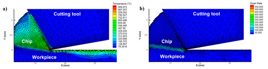Simulated temperature distributions (a) and strain rate (b) observed at 1350 m/min and 0.2 mm/tooth.