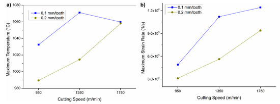 Finite element modeling results depicting (a) maximum temperature and (b) maximum strain rate as functions of cutting speed.