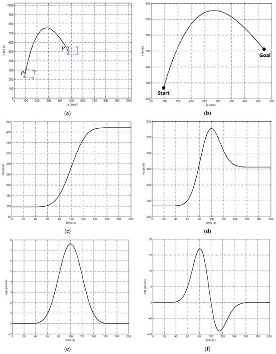 The dynamics of the desired trajectory: (a,b) the desired position trajectory of a point ; (c) the evolution of the trajectory along the -axis; (d) the evolution of the trajectory along the -axis; (e) the velocity dynamics of the trajectory along the -axis in pixel/s; and (f) the velocity dynamics of the trajectory along the -axis pixel/s.