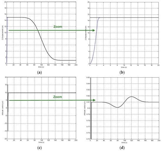 In the previous step, we generated desired trajectories for the variables , , and . Given that the proposed method separates altitude control (the displacement along the z-axis) from the other variables, we have the ability to independently choose the desired trajectory for the altitude. To evaluate the effectiveness of our control strategy, although we considered a constant altitude in the trajectory generation problem, we introduced a variable altitude as a source of disturbance, as follows: The quadrotor stabilizes at an altitude , then undergoes a gradual takeoff, acceleration in the middle, and smooth convergence towards the altitude . The parameters of Equation (17) ensuring the pursuit of this desired trajectory are chosen as follows: and . Taking into account the physical characteristics of the quadrotor, the control input for altitude must be bounded by . Figure 7a,b illustrate the evolution of the desired altitude and the altitude achieved by the quadrotor. It is clear that the quadrotor stabilizes around the altitude z = 15 m in less than 4 s and follows the desired trajectory. The evolution of the control law ensuring the desired altitude is presented in Figure 7c,d. It is evident that this is a continuous, smooth, and physically achievable evolution.