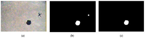 Target recognition: (a) original image; (b) binarization and opening; and (c) target selection based on the size criterion.