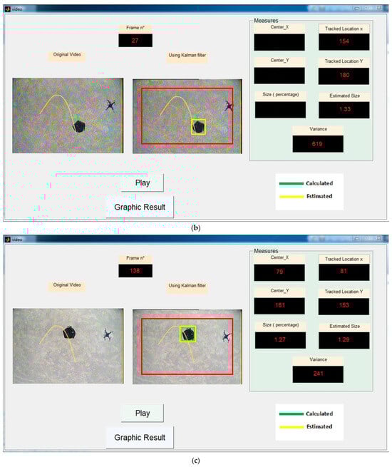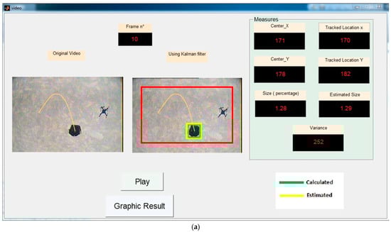 The desired trajectory in the image plane is built using Equations (36)–(40) with . Figure 10 shows the results of an experiment in which the DJI Phantom 1 takes off to reach an altitude of 15 m. Once the target has been detected (which will give us a starting point of ), a trajectory is generated in the image plane (the yellow curve). The mobile robot playing the role of the target is static throughout the experience. Its orientation, as well as its apparent size in successive images, are tracked by the movement of the quadrotor. The task of the quadrotor during this experience is to make the necessary movements to ensure that the target remains on the desired trajectory. In this phase, we introduced a Kalman filter to estimate the position and size of the target. This filter has proven to be very useful because the analogue transmission of the live streaming is sometimes very noisy. This makes the target detection phase impossible. Figure 10b perfectly illustrates this case. Despite the total absence of the target, our algorithm continues to generate the necessary commands based entirely on the estimated position (the yellow square). In Figure 10a,c–e, the green square shows the success of the target identification phase. We notice that the size of the target is almost constant during the first half of the flight (Figure 10a–c). This is completely normal since we have separated the command responsible for altitude from the rest of the commands. However, the size of the target suddenly changes in the second half of the flight (it became 10 to 15% smaller; see Figure 10d,e). This is due to a gust of wind. Despite this, the quadrotor continues to follow the desired trajectory by manipulating the , , and commands. This result shows in an experimental manner the benefit of the separation of commands proposed in the diagram of Figure 4. Finally, Figure 11 shows the desired and achieved trajectories. If we take into account the DJI Phantom 1’s experience with wind gusts and the target’s intermittent absence, the superposition of the two trajectories is almost perfect.