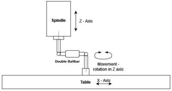 Ideally, on a perfectly accurate CNC machine, the resulting circular path produced by interpolation would match the programmed command. However, it is affected by several geometric and dynamic errors (encoder, straightness, temperature change, friction, etc.), and the resulting path does not have the same radius around the circumference. If the actual trajectory is accurately measured, it can be compared to the ideal trajectory and a measure of the accuracy of the MT can be developed based on this measurement. This measurement is described in detail in ISO 230-4. Figure 2 shows a schematic representation of the measurement with the DBB QC20-w (Renishaw, UK), (Figure 2).