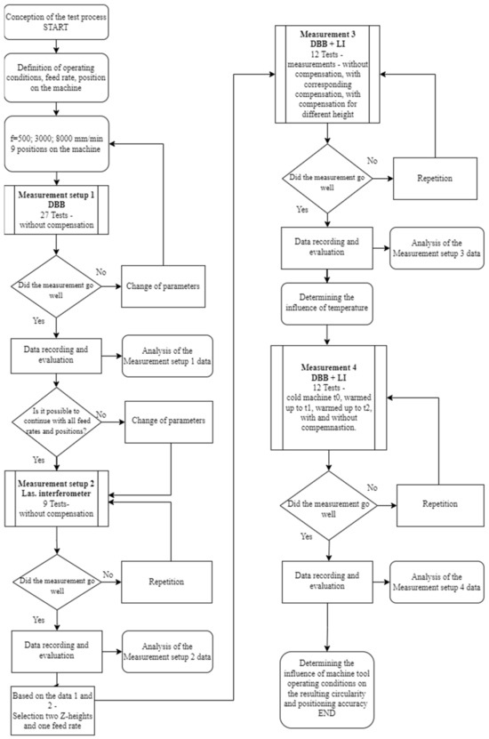 This section describes the design of the experiment. The tests include tests of circularity measured by the DBB and positioning accuracy measured by the laser interferometer. The effect of operating conditions at different measurement and machine settings will be monitored. The test procedure is shown systematically in the form of a flow chart in Figure 4.