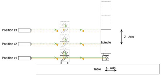 Figure 8 shows the three positions of the laser interferometer in the workspace of the machine. Only the Z coordinate changes when the laser interferometer position is modified. The measurement of the positioning error (EXX) is measured on the X axis.