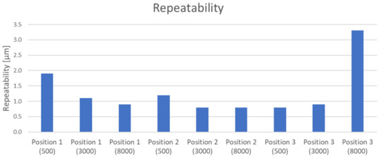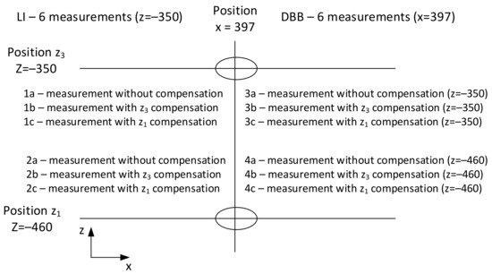 From the results shown in Table 3, the accuracy of positioning A and systematic positioning deviation E are dependent on the compensated position (z1 or z3). It can also be seen that the chocking of the compensation value, which varies with the position in the Z axis, is maintained. The R, B, and M parameters do not show any dependence on the compensation and Z axis position.