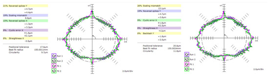The results of measurement setup 1 based on the circular interpolation test of two linear axes according to ISO 230-4 are shown in Table 4. The setting of the measurement parameter variables corresponds to the scheme shown in Figure 4. An example of the results of the ISO 230-4 analysis is shown in Figure 11. The graph on the left shows the results of the circularity error in the measured X-Y plane. The plots have a resolution of 2 µm/div and show the deformation of the circle corresponding to the change in scaling mismatch from 8.8 µm to 13.1 µm and the squareness error from 9.6 µm/m to −2.4 µm/m. These effects are then reflected in an increase in the circularity error from 9.7 µm to 11.3 µm. The setting for Test 1 is at a feed rate of 8000 mm/min. The graph on the right shows the results for Test 6 with the same feed rate of 8000 mm/min.