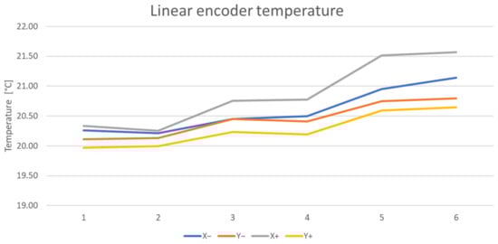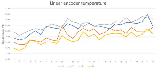 The temperature at selected points on the machine tool was also monitored. Specifically, these were linear encoders’ X and Y axis measurements where two temperature sensors were placed on each linear encoder’s measurement. The measurement process of setup 1 took 5 h. The horizontal axis of the graph in Figure 12 shows the number of measurements. The temperature difference during the measurement did not exceed 0.8 °C. From this point of view, the measurement is considered to be temperature-stable.