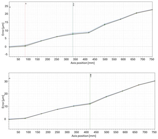 Measurement setup 2 was aimed at evaluating the positioning error using a laser interferometer and monitoring the effect of the change in machine position and feed rate. A demonstration of the results analysed according to ISO 230-2 is shown in Figure 13. The graph above shows the test setup for position 1 (z1) and a feed rate of 3000 mm/min. The positioning accuracy in this case is equal to 23.6 µm. The bottom graph shows the results for position 3 (z3) at the same feed rate of 3000 mm/min. The positioning accuracy in this case is equal to 31.0 µm.