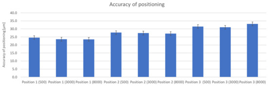 Positioning accuracy determines the accuracy and repeatability of ramp-ups to the desired position for linear and rotary axes. It is defined, among others, by ISO 230-2; VDI/DGQ 3441 [14]. Positioning accuracy is significantly influenced by the drive system and the type of assembly. The concept of positioning accuracy is often associated with the concept of repeatability, which is defined as the difference between the desired and actual value at n times the number of cycle repetitions. In practice, these two terms are often combined into the single word ‘accuracy’, although repeatability is more important, since it depends on the accuracy and mechanical unit of the machine, while accuracy can be ‘fine-tuned’ by corrections [9]. The laser interferometer measures the actual position of the milling machine table (Figure 1). The position of the table is measured using an optical sensor. The program processes these signals to calculate the deviation between the target position and the actual position.