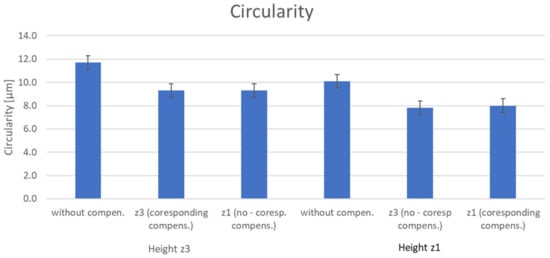 The results presented in Table 4 show that the observed parameters are not significantly dependent on the change of the Z axis position. The values are within 3 µm. The differences are only noticeable when the compensation is off or on. In the case of the circularity analysis, there is only a difference of 4 um in all measurements (Figure 16). In measurement setup 3, the measurement according to ISO 230-2 is more evident than the ISO 230-4 measurement. Of course, the ISO 230-4 test gives us more information about the machine tool in significantly less time.