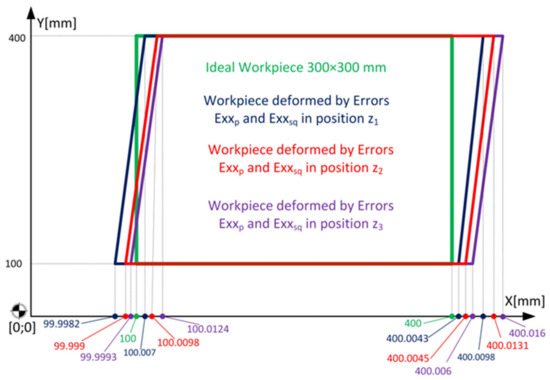 where Exxp is the positioning error obtained from the laser interferometer, Exxsq is the squareness error from the circularity test calculated for the change of position in the X axis, and zn is the position of the spindle in the Z axis. For position z1, which is defined by Test 7, Test 1, Test 4 for f = 500 mm/min (Table 4) and Position 1, f = 500 mm/min (Table 5), Equation (4) corresponds to the calculation of the position error: