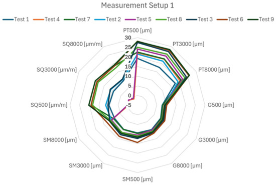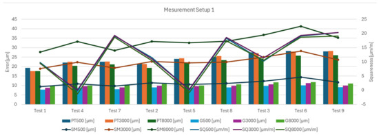 From the results of the measurement setup 1, the factors influencing the observed parameters, namely the position in the workspace and the feed rate, became apparent. The value of circularity increases with increasing velocity, which is due to the dynamic error namely reverse spikes. On the other hand, large changes are observed for the squareness parameter, which is strongly dependent on the position in the workspace. Furthermore, a difference of approximately 2 µm can be observed for the position tolerance parameter between feed rates of 500–8000 mm/min at each measured position in the machine. Figure 22 shows the display of the results from the circular interpolation test according to the measurement position in the machine workspace. There is a large variance in the position tolerance (PT) and individual tests that differ in X and Z axis positions. These results correspond to the measurements obtained with the laser interferometer. A second marked variance is then seen in the squareness errors (SQ) for tests 7, 8, and 9, which are located at position x = 152 mm and positions 1, 2, and 3 corresponding to x = 397 mm (Figure 23). The squareness error is therefore mainly dependent on the position of the x axis. The error of measurement (SM) is independent of the individual changes in the feed rate.