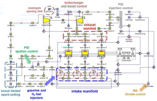 Figure 1. Overview of the 0D/1D simulation model in its gasoline/H2 PFI configuration with selected components highlighted.