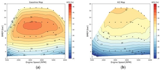 One of the main challenges associated with fuel conversion is the impact of hydrogen’s low volumetric energy density. This results in a decrease in specific power and, consequently, lower efficiency at various engine operating points than gasoline. It also modifies the energy conversion efficiency map, as evidenced in Figure 2. In this figure, several differences can be observed between maps (a) and (b), including the full load curve, where hydrogen experiences a lack of power, the brake thermal efficiency at different points, and the shape of the efficiency iso-curves. Reduced volumetric efficiency results in lack of power and therefore requires higher boost levels for obtaining the same power output. The difference in conversion efficiency observable when comparing Figure 2a,b is mostly due to the fact that extremely high laminar flame speed results in quick flame propagation and increased heat loss [31].