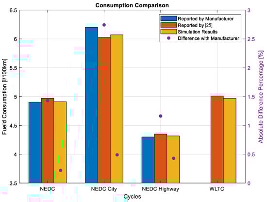 Model validity was confirmed through comparison of fuel consumption against data published by the manufacturer [32] and in earlier studies such as [29]; the comparison is shown in Figure 3. It illustrates the validity of the numerical results confirmed by the difference below 1% compared to the OEM data as well as the coherence between various versions of the model.