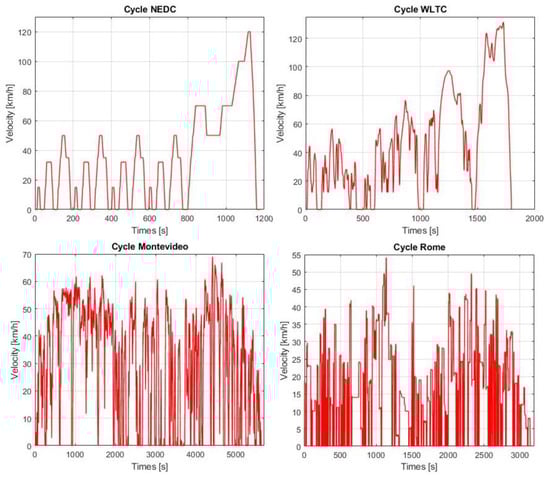 The vehicle is tested under different real driving cycles as well as under maximum acceleration test. The tested driving cycles encompass the NEDC, NEDC City, NEDC Highway, WLTC, which is a specific cycle measured in Montevideo and Rome. Figure 5 shows the driving cycles profiles and Table 3 the main statistics parameters. These cycles are designed to emulate typical driving conditions across diverse settings, including urban/downtown, urban/out of town, and highway environments. Their purpose is to simulate the vehicle’s behavior in varied scenarios, offering valuable insights for design improvements and evaluations. While four of these cycles adhere to standardized protocols, facilitating the comparison of simulation results with those of other vehicles evaluated under similar conditions, non-standardized cycles provide a more nuanced analysis of the vehicle’s performance in diverse scenarios. This extends to both gasoline and hydrogen-powered vehicles as well as hydrogen hybrid vehicles.