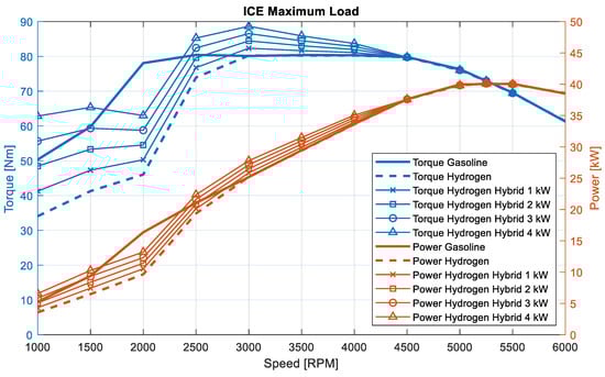 A previously mentioned factor critical in design and analysis is the “lack of power” due to lower volumetric efficiency specific for hydrogen. To demonstrate this effect and how different hybridizations compensate for it, Figure 6 shows the power and torque curves of the various configurations, which are all on the engine’s output axis. The addition of 3 and 4 kW EM allows the hydrogen engine to achieve the power of the gasoline engine already at 1500 RPM while improving the power at high engine speeds. To have a better analysis of the electric motor impact, the next section analyzes the performance under full acceleration with all engine versions.