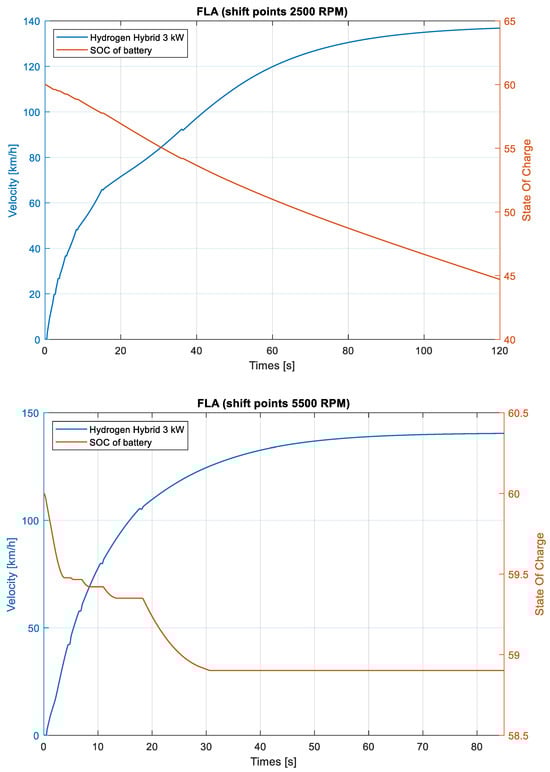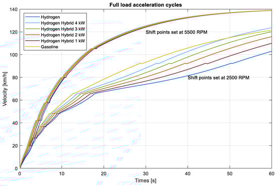 A comprehensive test was conducted primarily focusing on FLA of the engine to evaluate the vehicle’s performance. In this assessment, the driver controller was programmed to accelerate until reaching maximum power. As mentioned previously, the hydrogen engine exhibits a notable lack of power between 1000 and 3000 RPM. Consequently, a meticulous design approach was applied to both the EM, the belt, and the control strategy to effectively address this power limitation. Furthermore, to underscore the magnitude of this limitation in the results, two FLA tests were executed, with shift points set at 2500 RPM and 5500 RPM, which were both initiated with a launch speed of 1400 RPM. The outcomes of these tests are presented in Figure 7. A notable difference between purely gasoline and purely hydrogen versions can be observed as well as the difference between shift points. These contrasts are important as they clearly show the variation in performance between models with and without hybridization under different conditions. For the shift point set at 2500 RPM, the effect of each model is clearly observed. The hybrid versions of 1 and 2 kW fail to reach the top speed of the gasoline model even after an extensive amount of time. On the other hand, it is evident that in the hybrid versions, the 3 kW and 4 kW EMs effectively counteract this power deficiency. It is worth noting that even after 60 s of the FLA test, both hybrid models manage to surpass the gasoline model in speed. With the shift point at 5500 RPM, the impact of power lack is notably diminished. This is attributed to the shifts being executed away from the power deficiency zone, as vividly depicted in the image. It is noteworthy that the 3 and 4 kW models manage to equal or surpass the gasoline model almost all of the time, while at the beginning, the 1 and 2 kW models still remain slightly below the gasoline model.