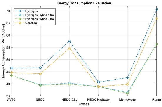 The results of this comparative analysis for the four configurations models are graphically presented in Figure 9. It is important to note that for these calculations, a LHV of 43.5 MJ/kg for gasoline and 120.0 MJ/kg for hydrogen was employed. This meticulous consideration of energy values enhances the accuracy of the comparative analysis, providing valuable insights into the performance differentials across the specified driving cycles.