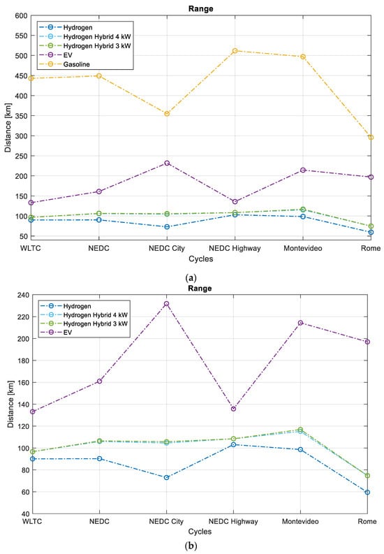 To replicate the fuel tank in the model, a 30 L hydrogen tank at 700 bar [25] was employed, factoring in a density of 42 g/L. The models were programmed to regulate their cumulative fuel consumption. Once the tank’s predefined limit was reached, the simulation was halted, yielding the distance covered by the vehicle in each driving cycle. Figure 10 shows the range achievable with different configurations across various driving cycles; these include hydrogen hybrids, pure hydrogen, electric and gasoline vehicles. It should be noted that the autonomy of gasoline models is considerably greater than hydrogen models, usually exceeding 400 km. For a better visualization of the autonomy of the hydrogen and electric models, the bottom of Figure 10b is added, where the range of the gasoline model is removed. However, compared to the electric version of 17.7 kWh lithium-ion battery and 133 km under WLTC, the hydrogen version shows similar behavior [34]. This deliberate exclusion serves to focus the analysis on the specificities of hydrogen models and their respective ranges. It is important to note that the refueling time for the 30 L hydrogen tank in a vehicle is approximately 5 min. Meanwhile, in the electric vehicle, the maximum charging time is 1 h with a 22 kW charger at 400 V, and with a home charger, it can take up to 9 h, all for charges from 0 to 100% [32,35].
