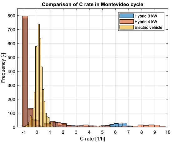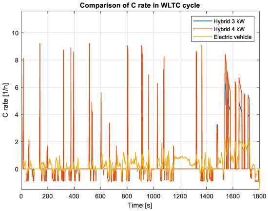 Due to engineering considerations in both vehicle design and production, it is important to consider the vehicle’s battery [36,37,38,39]. Therefore, an analysis of the current thought the battery connections is performed: specifically, the C-rate (Current (A)/Battery Capacity (Ah)) to which it is subjected is conducted, as it is of great importance for its lifespan. The 3 kW and 4 kW hybrid hydrogen models and the electric model are analyzed. It is important to understand that in this work, the battery in the HEV and the EV have the same chemical composition for a fair comparison.