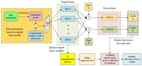 Initially, in this section, a data generation method, based on the digital twin model, is introduced. Consequently, the MMoE-LSTM network structure is presented, consisting of an improvement of the MMoE multi-task network architecture. Finally, the enhanced multi-task loss function, based on coefficient of variation weighting and L2 regularization, is highlighted. The overall workflow is shown in Figure 1.