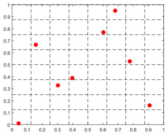 Latin hypercube sampling is a method utilized for selecting sample points within a multi-dimensional space. The primary objective is to generate a set of points that are uniformly distributed across the parameter space [38]. Assuming there are n input variables and m experimental design points, each variable is divided into m levels from the lower to the upper limit values. The value of each variable is randomly chosen from one of the levels, and each variable’s level of values is unique, thus constituting an experimental design point. In a matrix with dimensions m × n, each column represents a variable and each row represents a level. The sampling method is shown in Figure 3, the red dots on each column represent the level represented by a single sample on each parameter dimension.