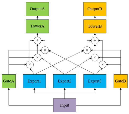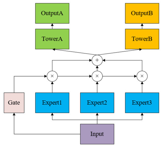 The MMoE model, an improvement of the MoE model, falls under the soft parameter sharing category. The structural framework diagram of the MoE network model, as shown in Figure 4, comprise three main components: an Expert layer, a gating network, and an output layer. The Expert neural network consists of a single-hidden-layer fully connected neural network, and its hidden layer activation function uses a Rectified Linear Unit (ReLU) to enhance the nonlinear mapping and mitigate overfitting. As for the gating network, this dynamically determines the importance of each Expert neural network for different tasks based on the input data. For each input data point, the gating network assigns weights to the output results of each Expert neural network, thereby evaluating the contribution of each Expert neural network to each task. Finally, for the output layer, each task’s output result is processed by a separate Tower neural network. This neural network combines the output results of each Expert neural network with the weights assigned by the gating network to produce the final output of the task results.