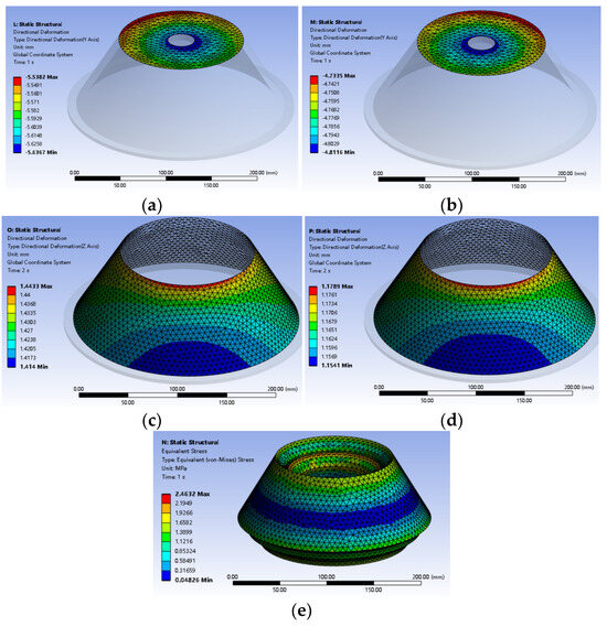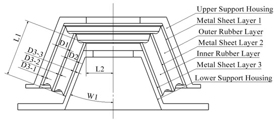 To construct a simulation model and conduct simulation calculations, it is imperative to initially create a three-dimensional model of the elastic support for the wind turbine. A simplified cross-sectional sketch of the wind turbine elastic support structure is depicted in Figure 8. This comprises a conical metal–rubber composite structure consisting of two layers of rubber, three layers of metal sheets, an upper support shell, and a lower support shell. Between the outer layer of rubber and the upper support shell, a layer of metal sheet 1 is installed. Additionally, between the two layers of rubber, metal sheet layer 2 acts as a separator. Similarly, between the lower support shell and the inner layer of rubber, metal sheet layer 3 is placed. The metal and rubber layers are connected by hot vulcanization, with each metal sheet layer possessing a uniform thickness.