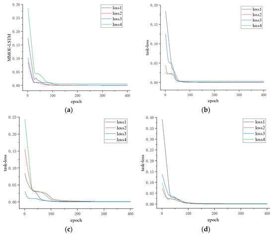 Under the same network framework (MMoE-LSTM) and parameter settings, the loss function optimization method proposed in this study outperforms other multi-task loss function optimization methods when being applied on both datasets. After optimizing the loss function, although the MMoE-LSTM model does not fully outperform the un-optimized model in predicting all four tasks, it successfully tackles the problem of premature convergence of individual task loss functions and imbalanced loss decrease between tasks due to the poor correlation between tasks. Therefore, the loss of each task reaches a magnitude of 1 × 10−4. A comparison chart is given in Figure 12. Compared to the use of the proposed loss function optimization method during the MMoE-LSTM model training process, the loss functions of the four tasks have all decreased to a lower level, without encountering the problem of premature convergence of a single task’s loss function due to poor correlation between individual tasks.