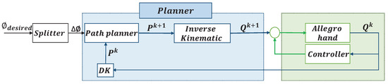 The main idea of the proposed approach is to use an ANFIS planner to plan the hand movements to produce the dexterous manipulation of unknown objects. The ANFIS planner is a data-driven planner based on a trained and validated ANFIS structure that aims to perform planning tasks. Unlike analytical planners, ANFIS planners have high adaptability and, therefore, can better generalize across a wider range of scenarios. They can learn and adapt their decision-making process based on the observed input–output relationships in the environment. The ANFIS planner predicts values of the next step configuration of the hand () based on current fingertip positions (). Figure 1 presents a diagram of the system using an analytical planner that works as follows: The input to the system is the desired total rotation angle of the manipulated object around a given axis, , which is split into small rotation steps, , used as input for each manipulation iteration until the target, , is achieved. The current positions of the fingertips, P, are obtained from the current configuration of the hand, Q, and used jointly with the desired rotation, , by a path planner to determine the proper movements of the fingers to (try) to produce the desired rotation of the object. The planner generates the desired final position of each fingertip, , and using inverse kinematics, the corresponding positions of the hand joints Q are obtained and fed to the control system of the hand. Now, Figure 2 illustrates the alternative proposed diagram using the ANFIS planner. The ANFIS planner replaces the two main components of the analytical planner: on the one side, the path planner is replaced by an ANFIS path planner (ANFIS-PP) that works based on learning from experience and data, and, on the other side, the IK module is also replaced by an ANFIS module (ANFIS-IK) that is previously trained. Even when the IK of a finger is analytically known, since the general goal of the work is to perform object manipulation using only learning approaches, the analytical IK module was replaced by a learning module trying to minimize the required knowledge about the system.