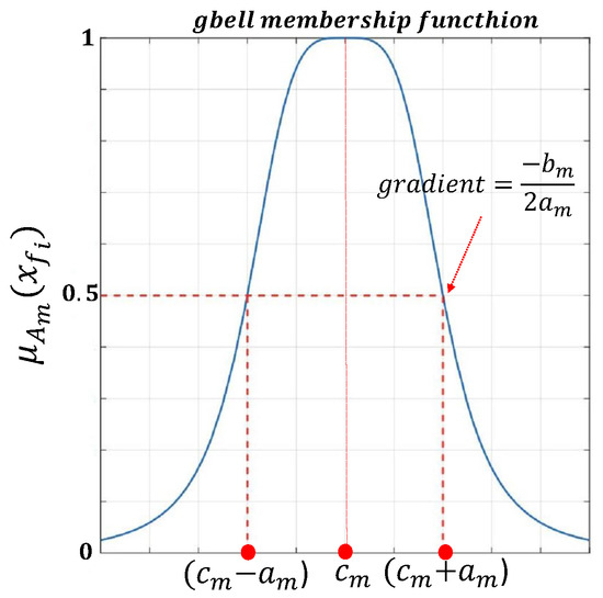 - Fuzzification layer: In this layer, there are a number of membership functions () for each input, i.e., , , and with . is a hyper-parameter selected by humans and based on compromising the accuracy and computational burden. In our particular applications, we choose . The selected type of these membership functions is a generalized Gaussian bell membership function (see Figure 4) defined as follows:where , and are the fuzzy membership degrees for each input variable, and , , are defined as premise parameters that determine the shape of the membership function and are optimized using back-propagation to minimize the error between the model output and the actual target values.
