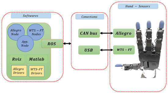 Experiment setup overview: The Allegro Hand is connected to a PC with a CAN bus and WTS-FT sensors at the fingertips with a USB port. All the software components are integrated using a robotic operative system (ROS) as the communications layer. The nodes are modular components in the ROS architecture that perform specific tasks and the drivers are the software component that facilitates communication between the ROS and a specific hardware device.