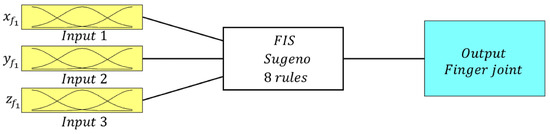 - The inverse kinematics of the fingers (ANFIS-IK). In this case, an ANFIS system is used to learn each of the joint values of a finger from the Cartesian components of the fingertip position (i.e., , , and ). Thus, the input to the system in Figure 3 is a fingertip position and the output is . This implies that the number of ANFIS systems involved in an ANFIS-IK is equal to the number of joints of each finger.