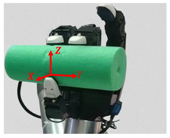 As mentioned above, in this work, dexterous manipulation is performed using only three fingers: the index (), the thumb (), and the middle finger (), with the thumb working opposite to the other two fingers in the same way that humans do. The desired manipulation is the rotation of the grasped object, forward and backward, around any of the axes, X, Y or Z, with the origin located at the thumb fingertip position, the X-direction perpendicular to the hand palm plate, and the Z-direction parallel to the middle finger when it is fully extended (see Figure 8). The object is unknown, which means that its properties (like shape, weight, and center of mass) are not known during manipulation. The grasping of the object is outside the scope of this work, so it is assumed that the object is already properly grasped before starting the manipulation.
