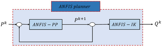 The data set for the training of ANFIS-PP, denoted as , includes , used as the input, and as the output. Subsequently, is used as the input for ANFIS-IK and as the output. Furthermore, is fed back into ANFIS-PP to compute the positions for the next iteration. It is noteworthy that ANFIS-IK is trained using the data set . A schematic of the implemented ANFIS planner is shown in Figure 10. We utilized the ANFIS structure with a hybrid optimization approach and conducted 30 training epochs for both ANFIS-PP and ANFIS-IK.