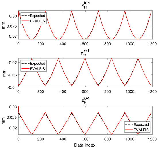 - Defuzzification layer: In this layer, there are eight adaptive nodes with a function that outputs the weighted value of a given rule as:where , , , and are defined as consequent parameters that will be trained by a supervised learning algorithm.