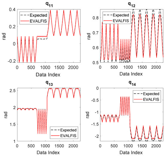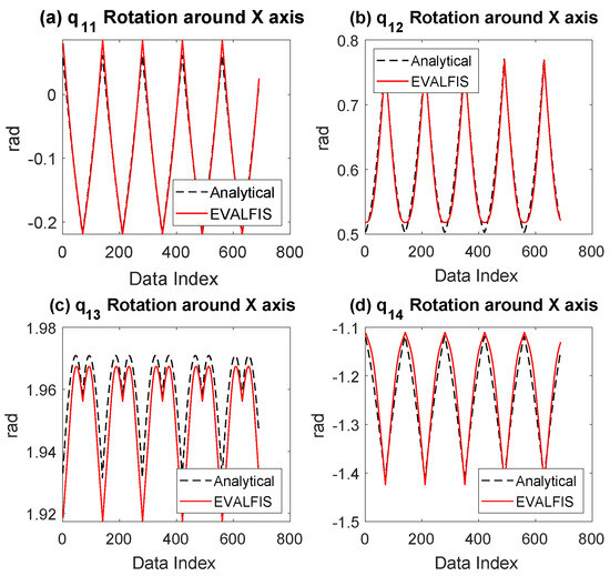 As an example of system performance in the real-world experiment, Figure 17 shows a comparison of the ANFIS and analytical planner outputs for the index finger joints, , , , and during rotation around the X-axis, under identical conditions. It can be noticed that the planner outputs are relatively similar to each other; however, the ANFIS planner attempts to do the task more smoothly.